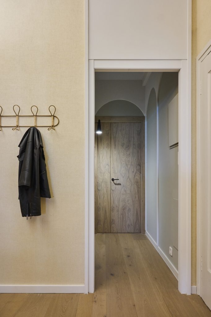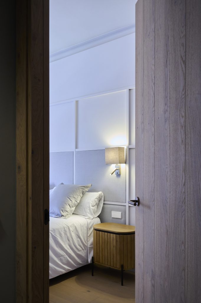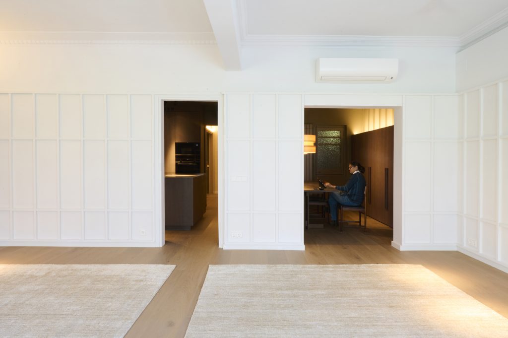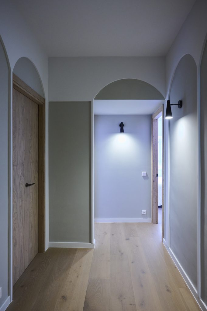 El diseño se adaptó a las necesidades del cliente en tanto que la distribución a la nueva forma de vivir los espacios en nuestros tiempos es la premisa y el objetivo de la renovación. Y con esto, se hace aún más evidente la diferenciación entre los espacios privados destinados a dormitorios, estudio, baños, etc., que mantienen sus dimensiones originales, y los espacios comunes destinados a vestíbulo de entrada, cocina, comedor y salón, que se agrupan en un único espacio, aunque a veces intercomunicados por pasajes de tamaño limitado. Se trabajó con madera natural en el suelo, en el revestimiento de algunas paredes y en el mobiliario de la cocina para dar calidez al espacio. Trabajamos con colores para acentuar la luz y la sombra. Trabajamos con tejidos para obtener mayor confort. Trabajamos con materiales nobles para aportar calidad. Jugamos con la luz artificial para añadir «acentos». Utilizamos todas las herramientas disponibles para construir un nuevo interior en un espacio existente que tiene sus propias limitaciones y límites.